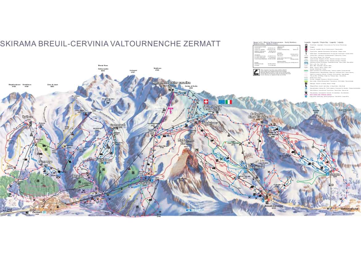 The wider Cervino/Zermatt Matterhorn ski area has over 350kms of piste, with a further 35kms at Chamois and Torgnon.