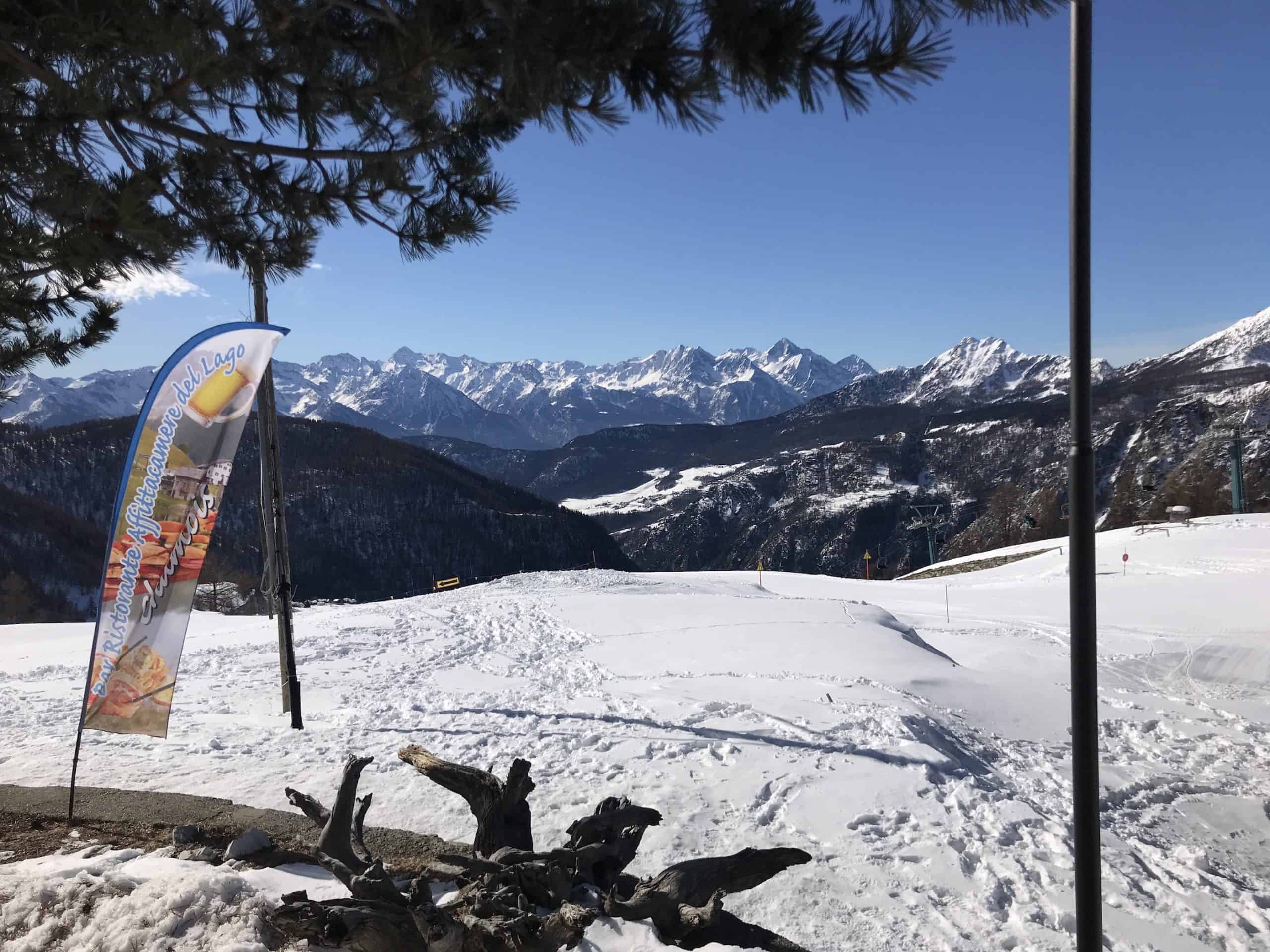 Valtournenche is 6 miles away from Camping Cervino with good free parking at Plan de Glaea with gondola access to the Cervino ski area, which rises up onto the slopes of the Matterhorn above 3500m. There is also an option to ski over into Zermatt. On a good day this area is superb with some of the longest runs in the Alps from some of the highest lifts. True motorway skiing. It is however very susceptible to high winds with the lift link to Cervino and Zermatt regularly closed.